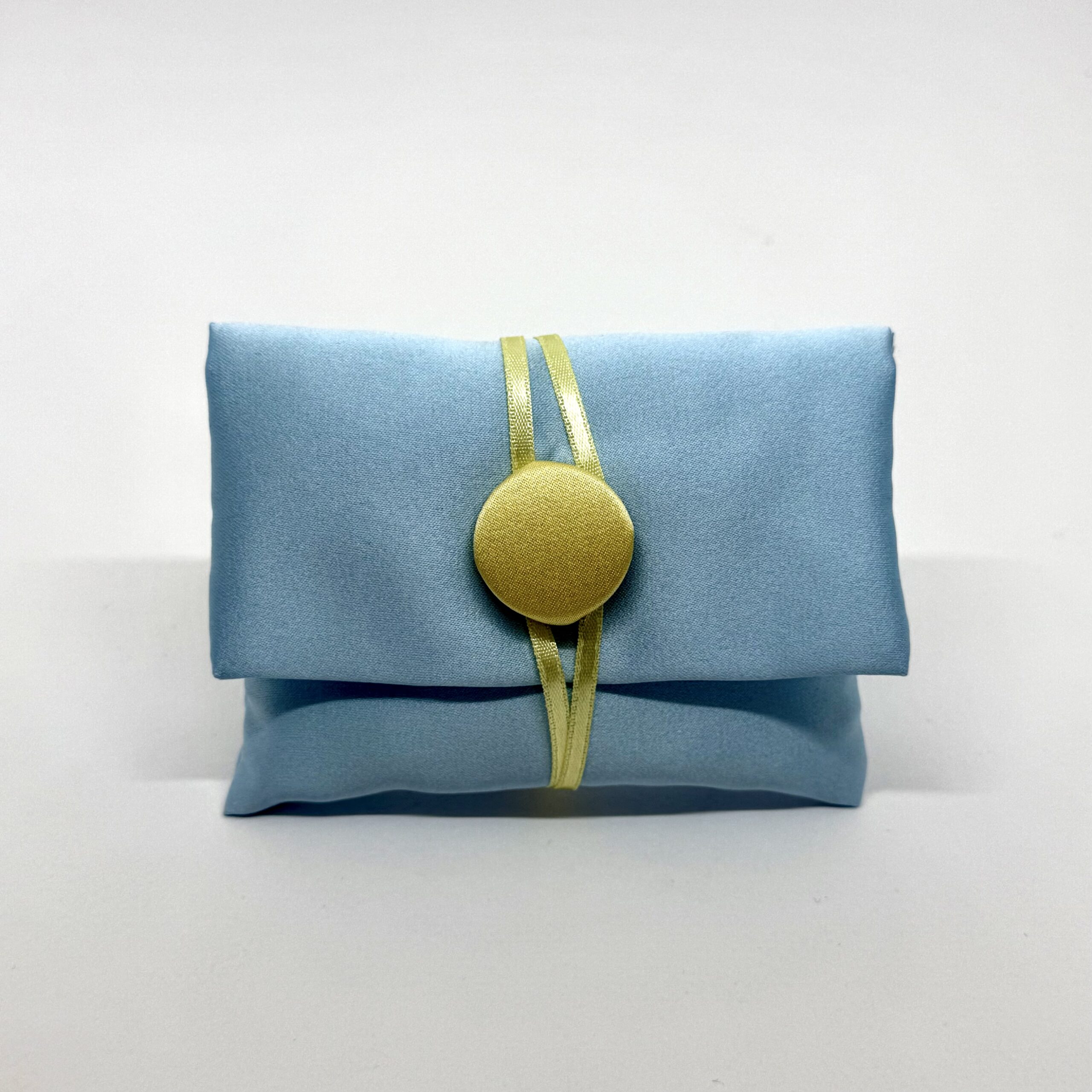 busta in raso duchesse celeste con bottone giallo e 3 mm giallo