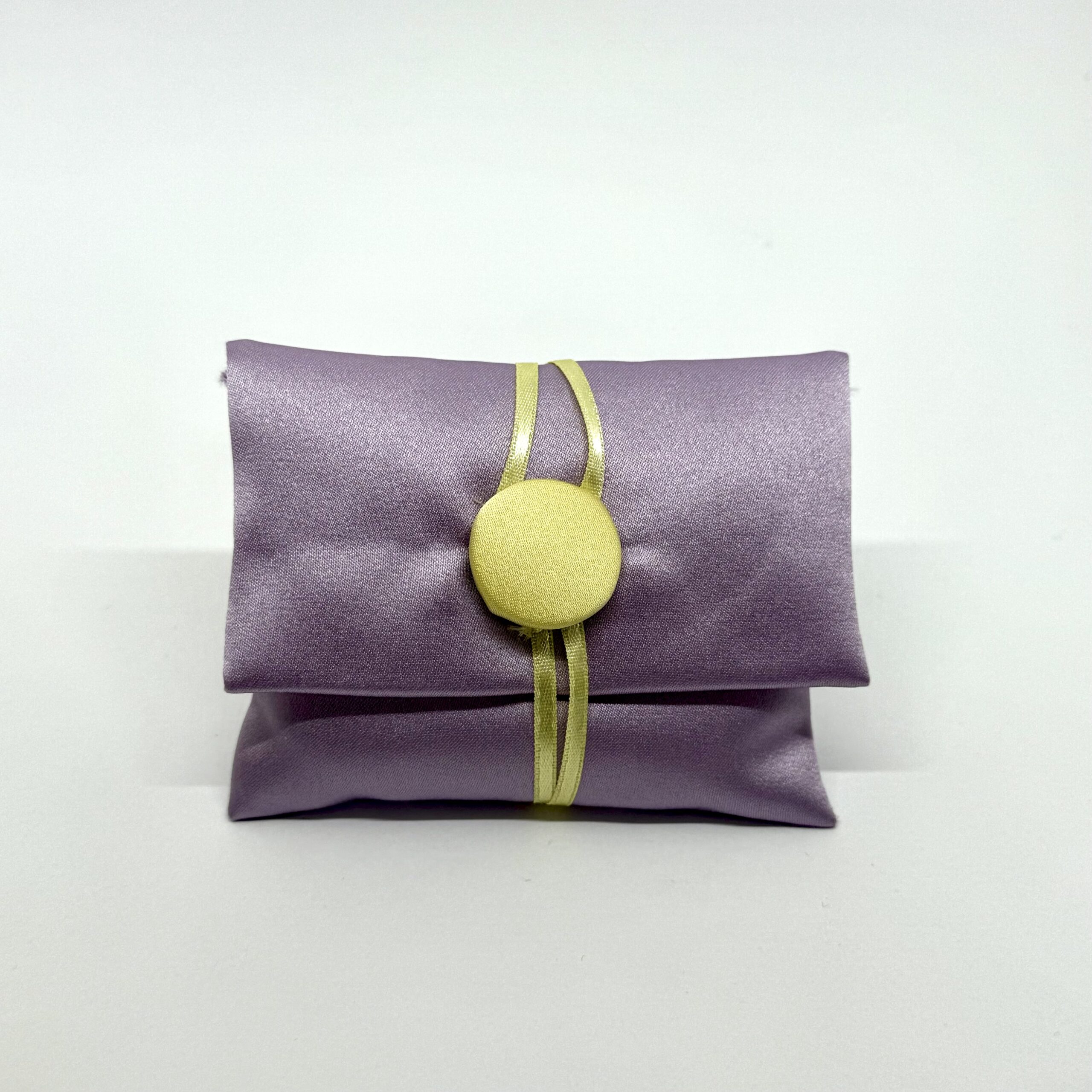 busta in raso duchesse glicine con bottone giallo e 3 mm giallo