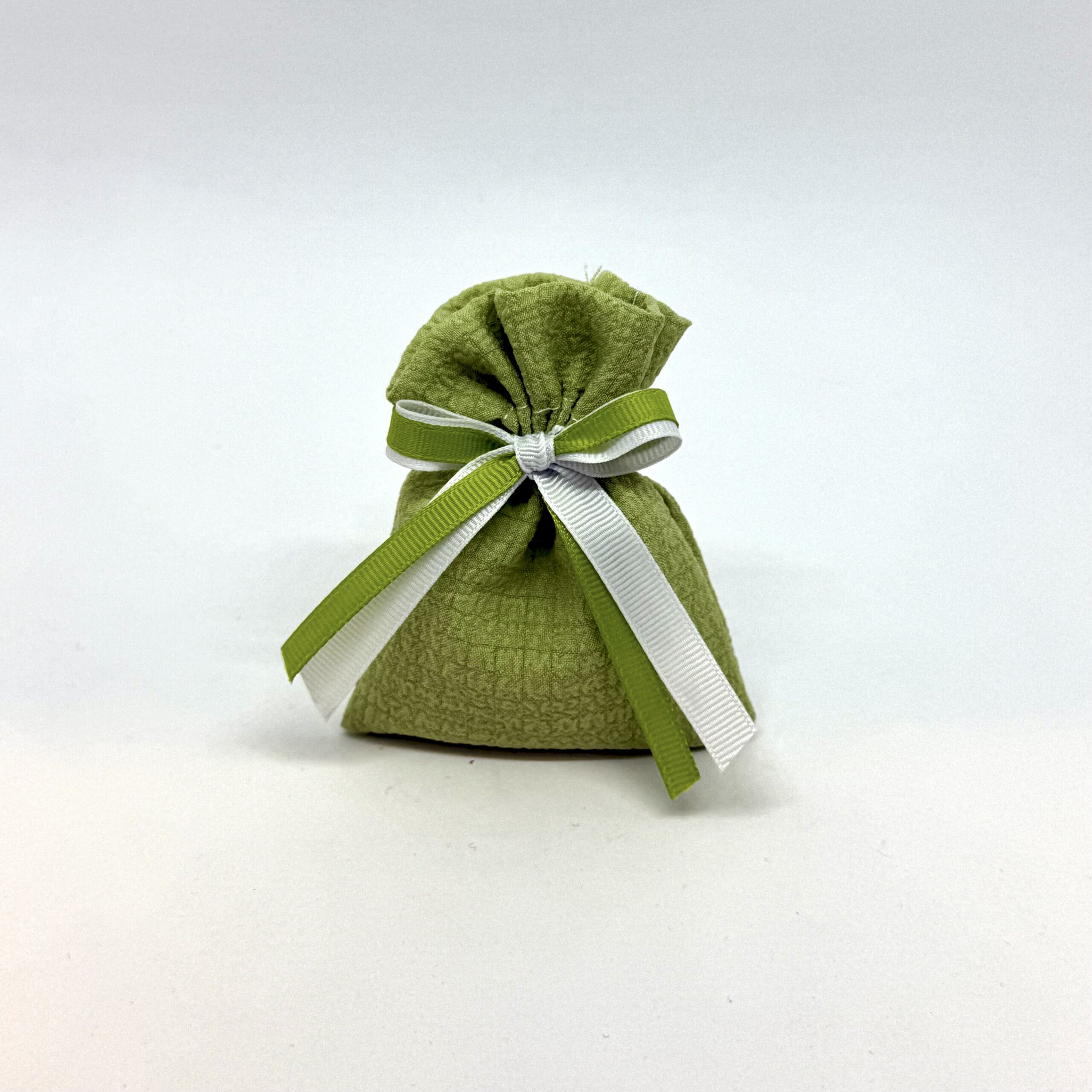 sacchetto crépe di seta verde con tirante , doppio fiocco verde e bianco