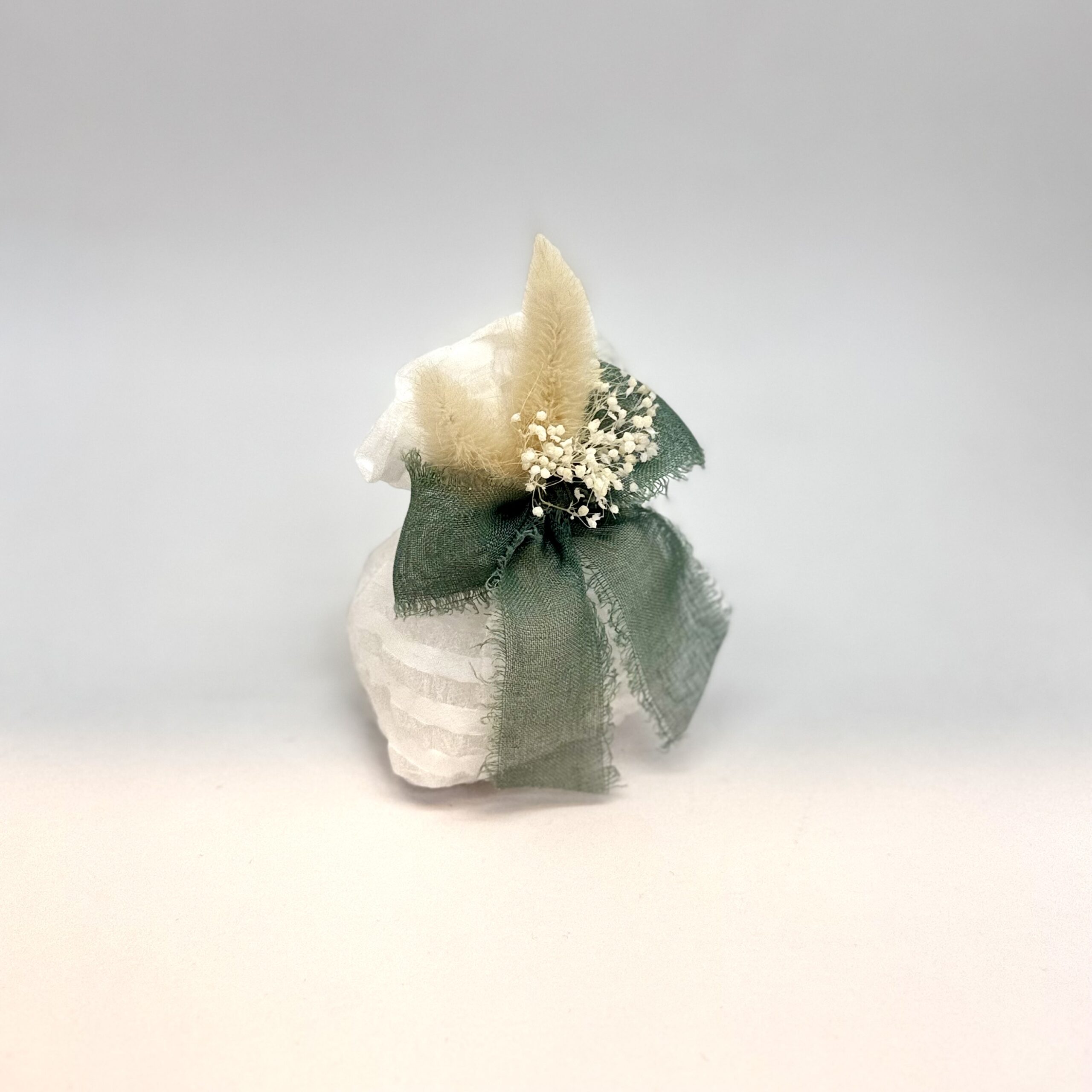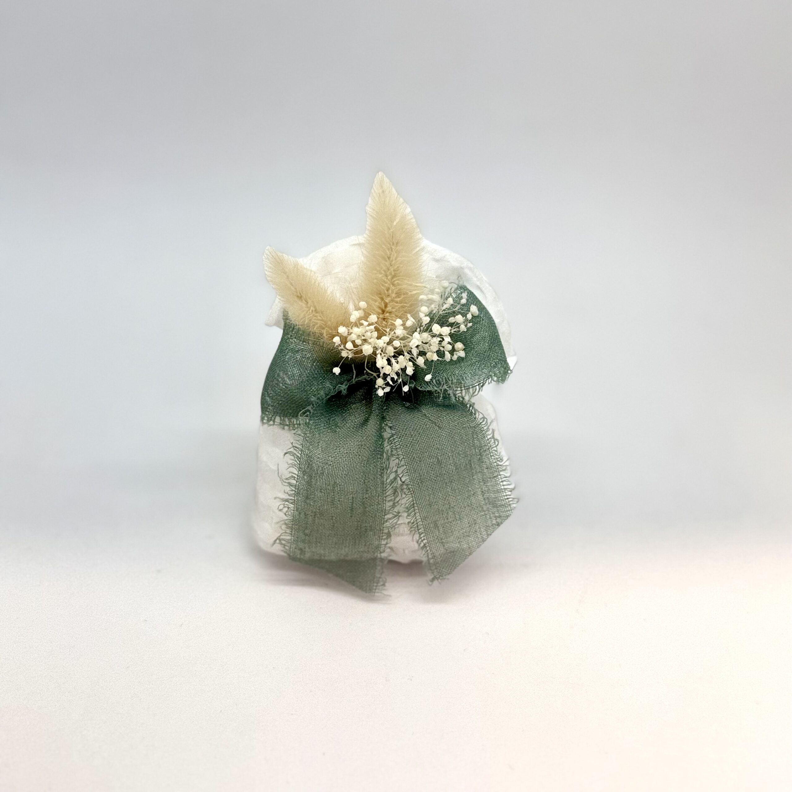 Saccotto organza rigata bianco con fiocco in garza di lino color verde, gipsophila e piumini avorio